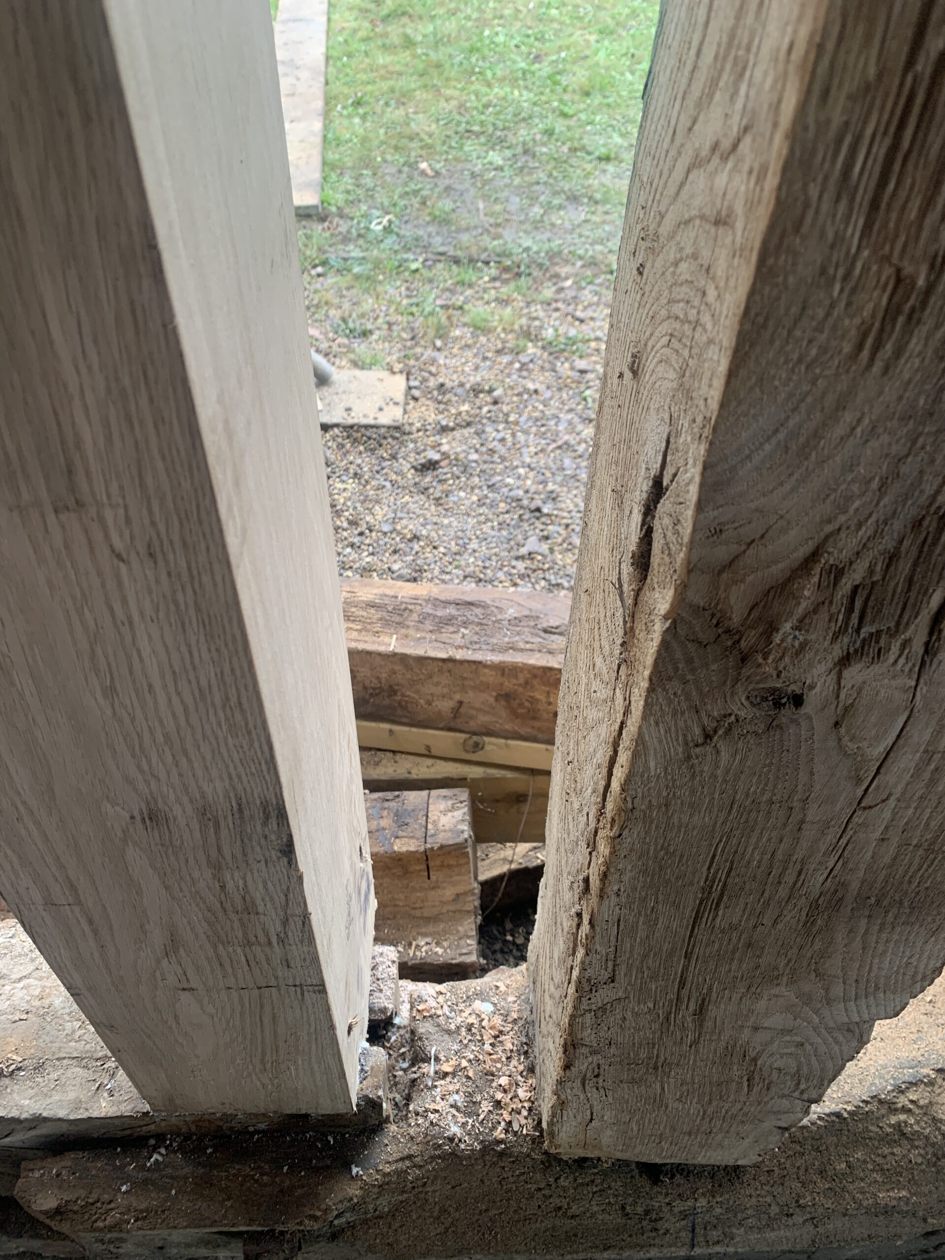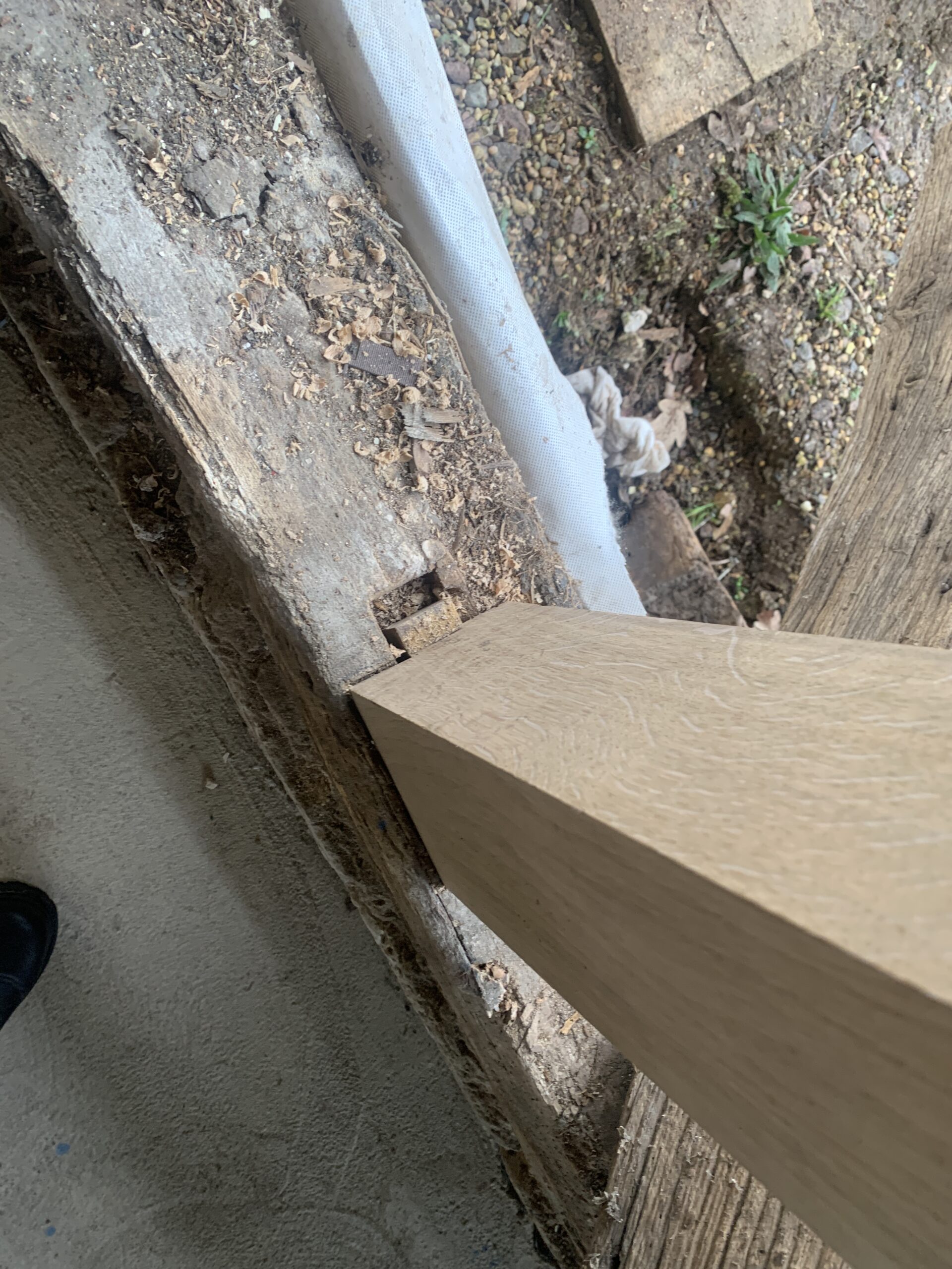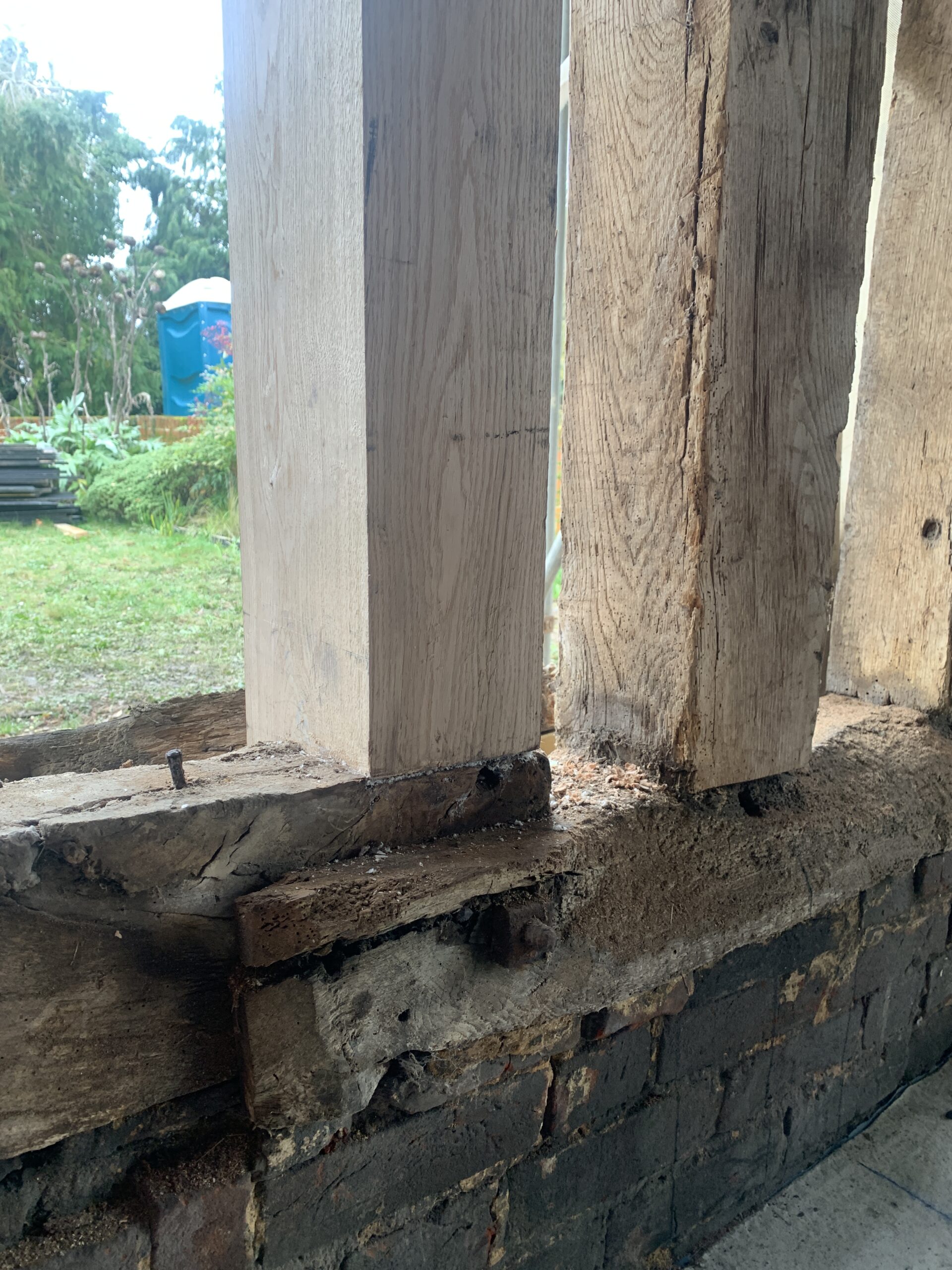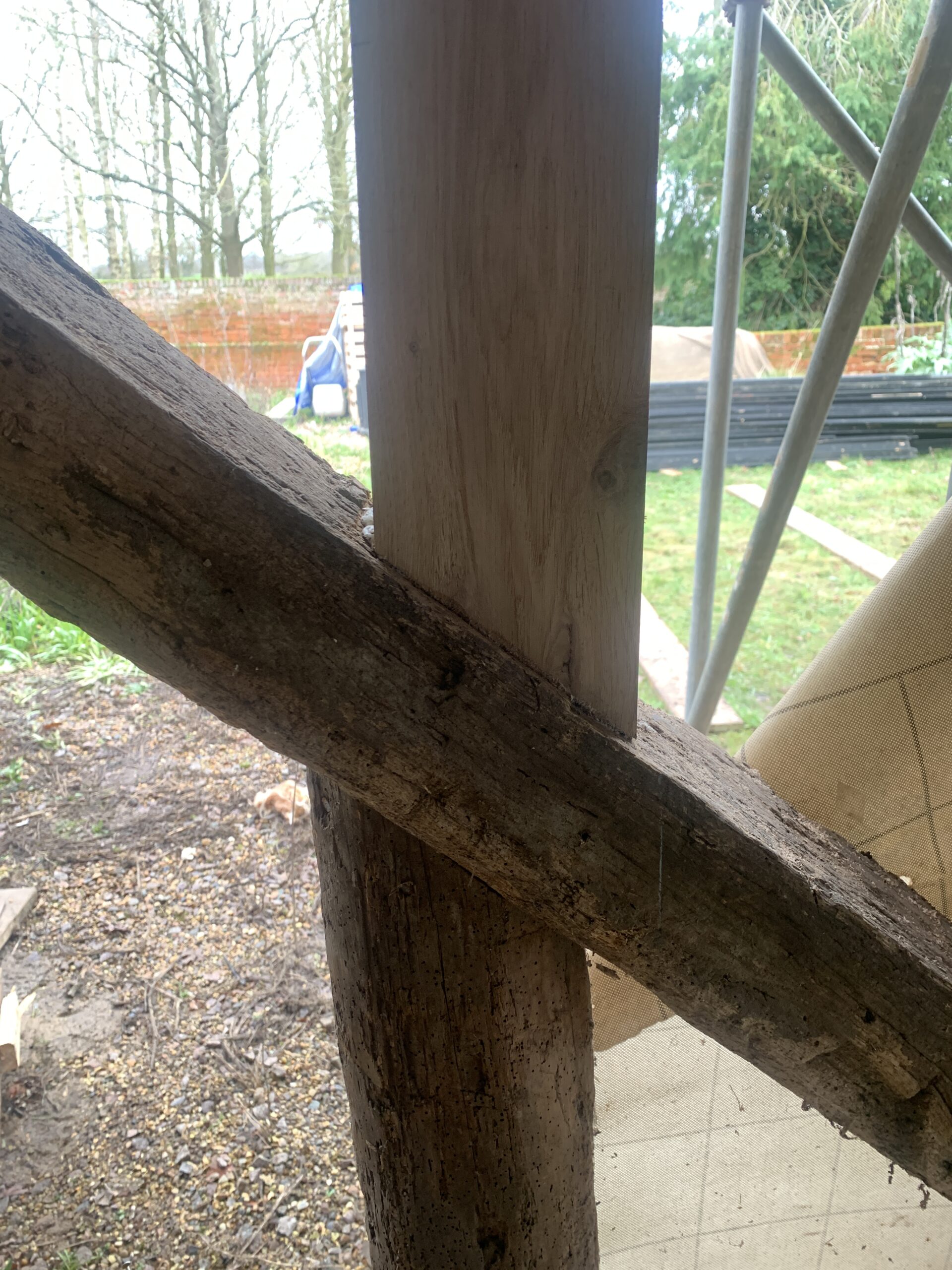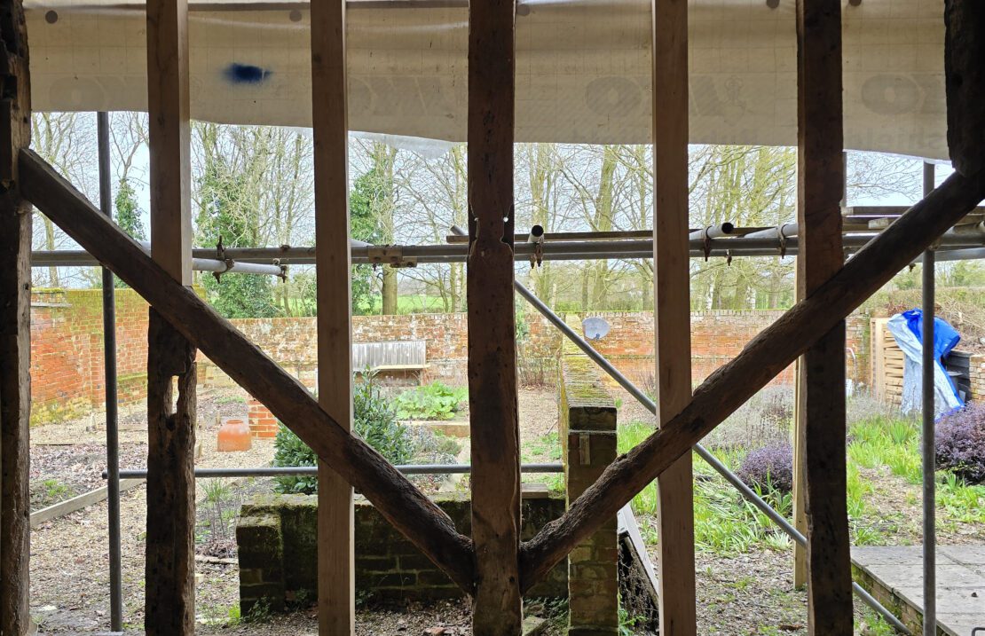 On site in Suffolk – the conversion of an existing barn in the curtilage of a Grade II Listed house, to provide annexe accommodation for the client’s parent. Progress is being made with repairs to the historic timber frame, which will be left exposed on the inside of the building. The frame is being retained as much as possible, with localised replacement timbers being installed where necessary. Once the frame is repaired, insulation will be added, using a combination of blown hemp insulation between the frame and woodfibre boards over the outside face.
