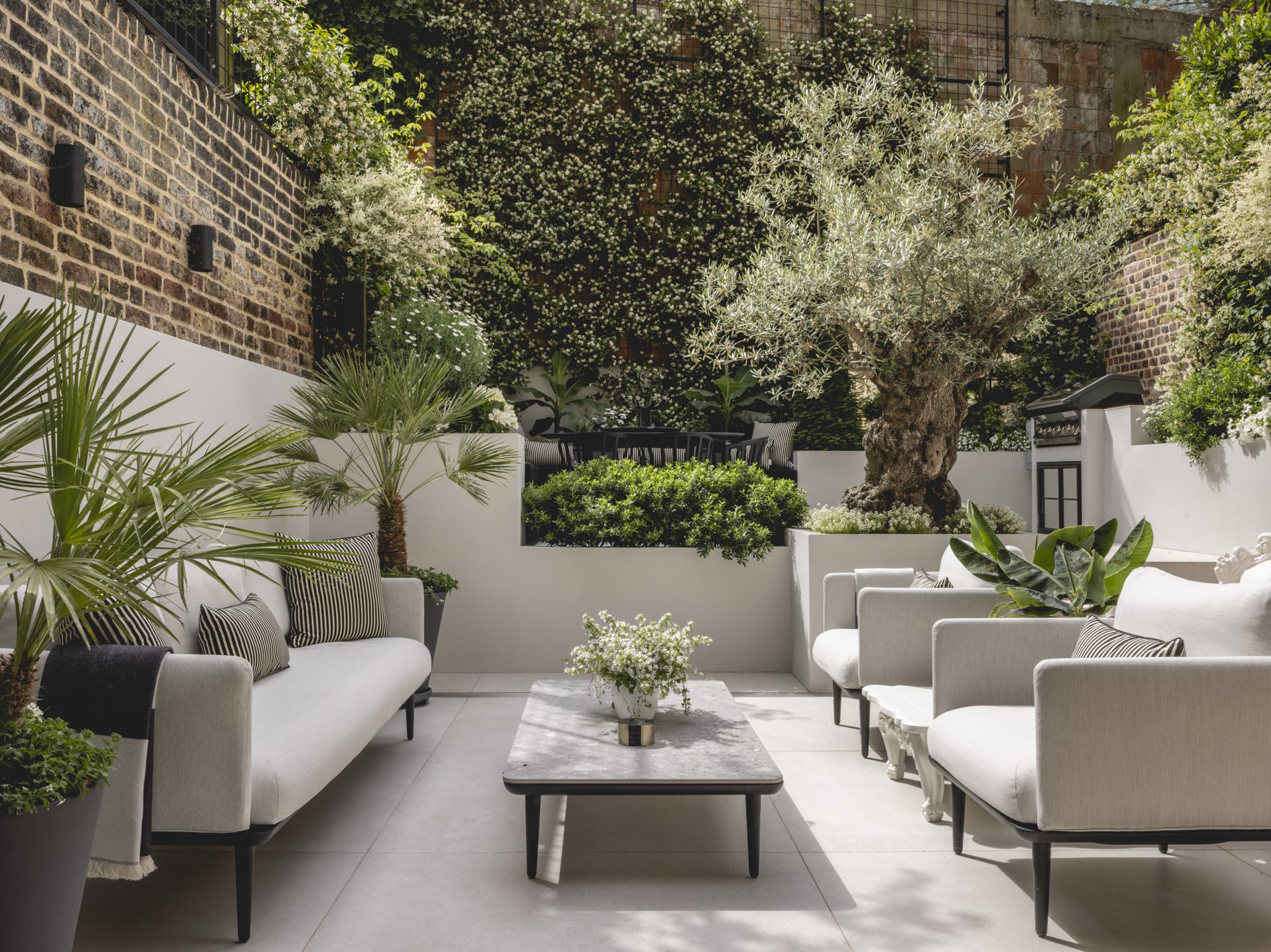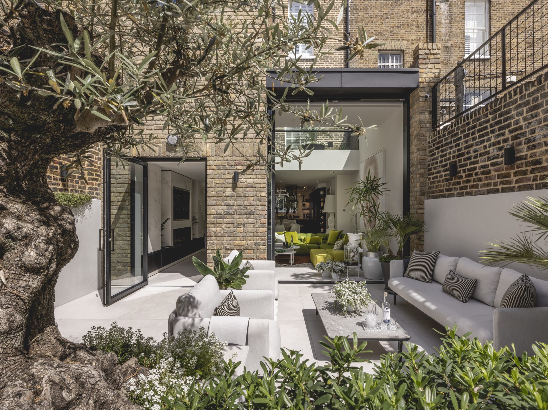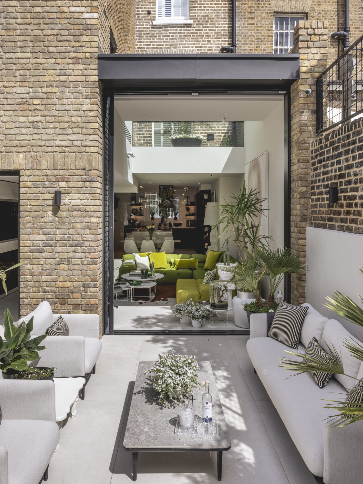 As part of the works, the existing lower ground floor and rear garden have been excavated to a single level, and the extension has been replaced with a new matching brick addition over 2 floors. New tall glazed doors by L2i (that are neatly concealed in pockets when open) lead from the open plan kitchen/dining/living area to the extensively remodelled garden, with planting scheme by Kate Eyre Garden Design.